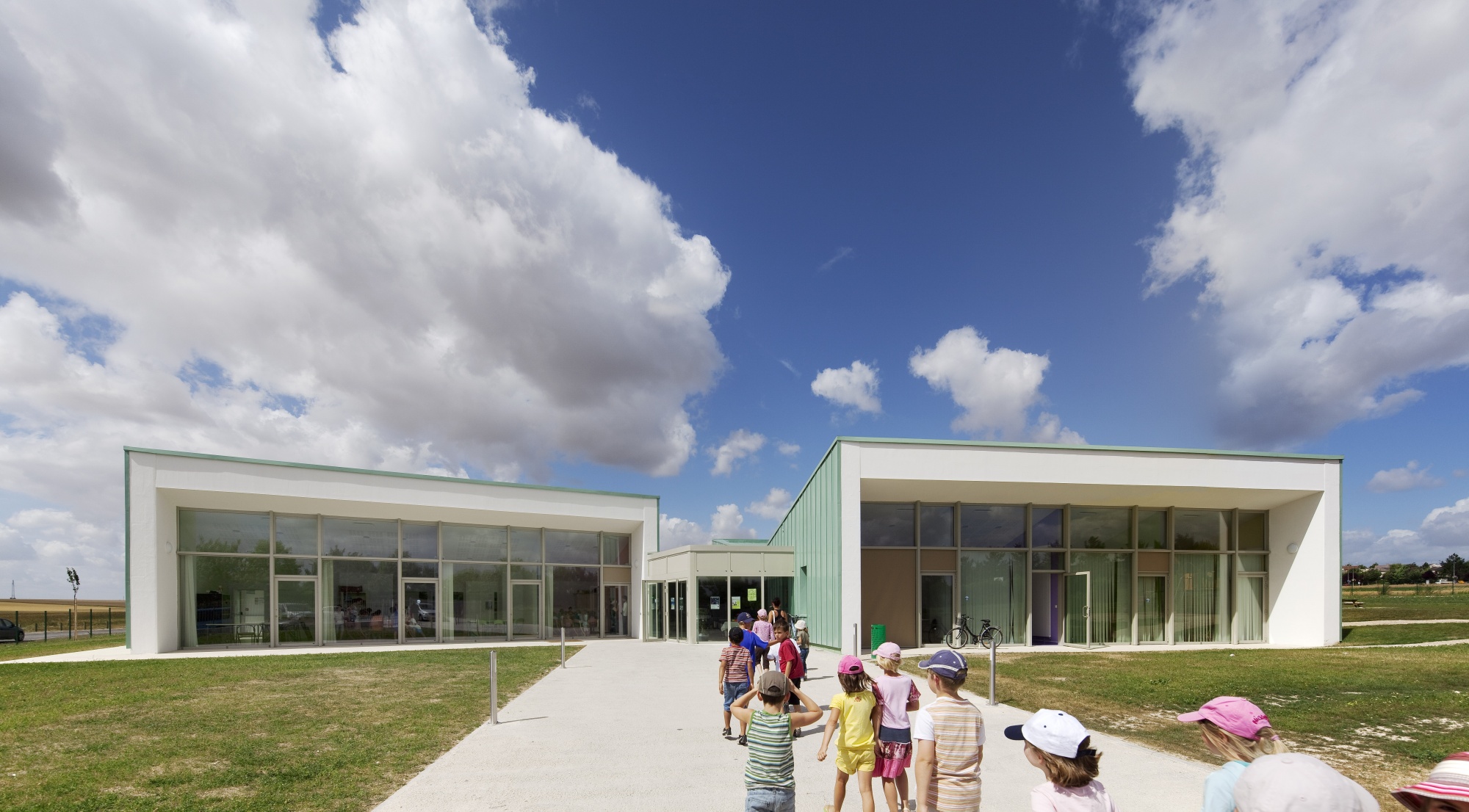 Le cabinet d'architectes Fouqueray-Jacquet a imaginé un ensemble composé de deux grands bâtiments quasi identiques, accueillant l'un la salle de restaurant, l'autre l'espace commun d'activités, le tout relié par un hall d'accueil.