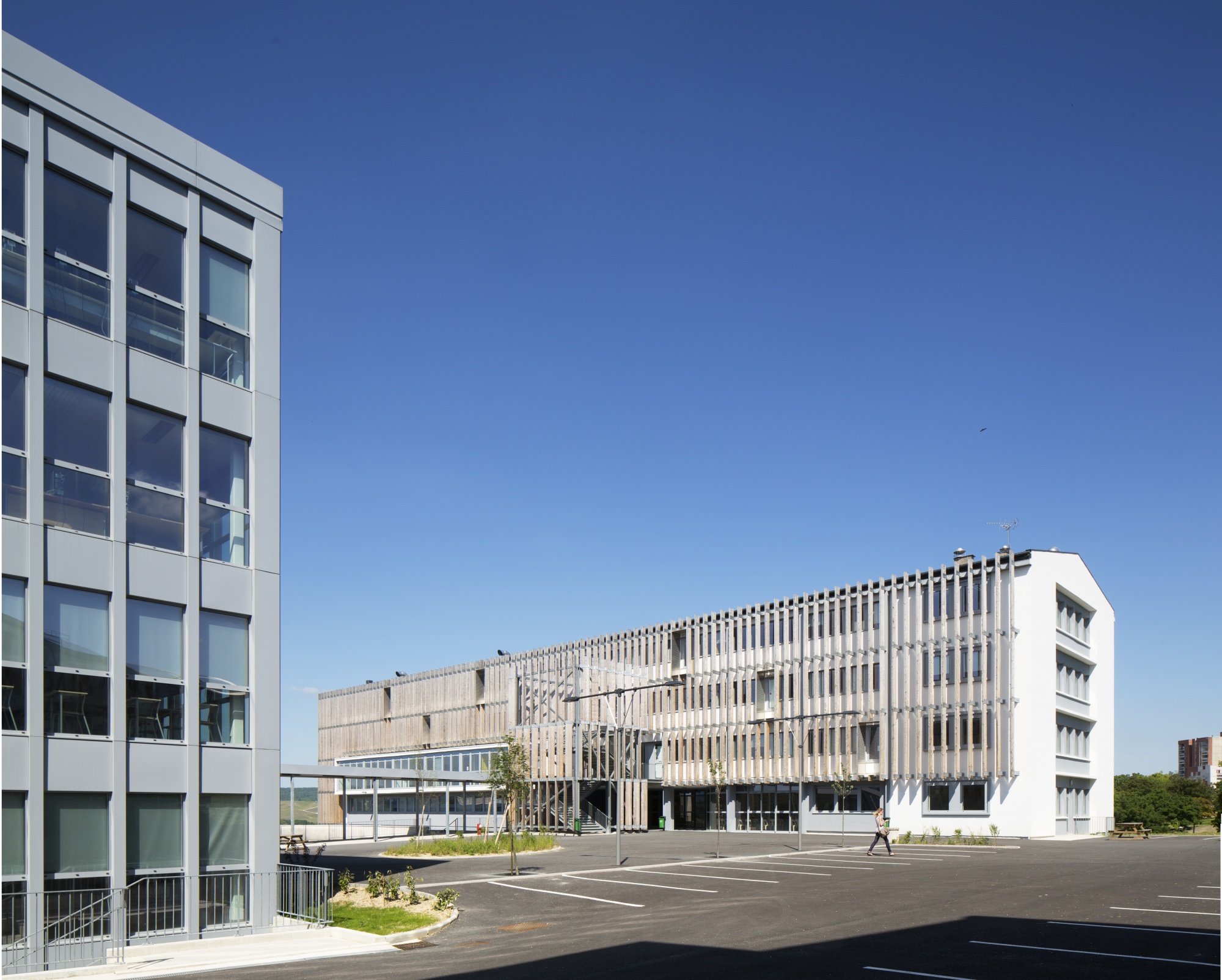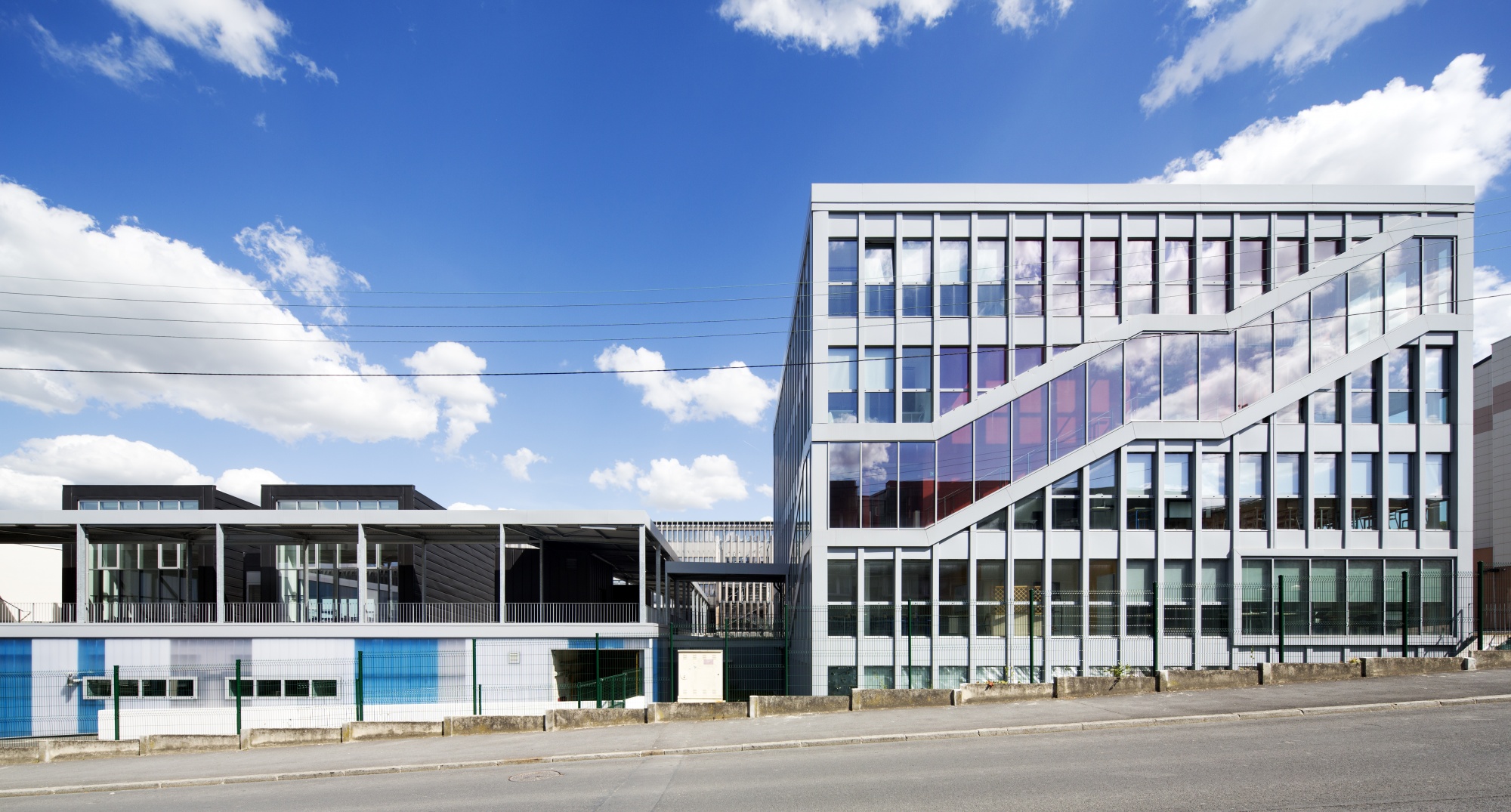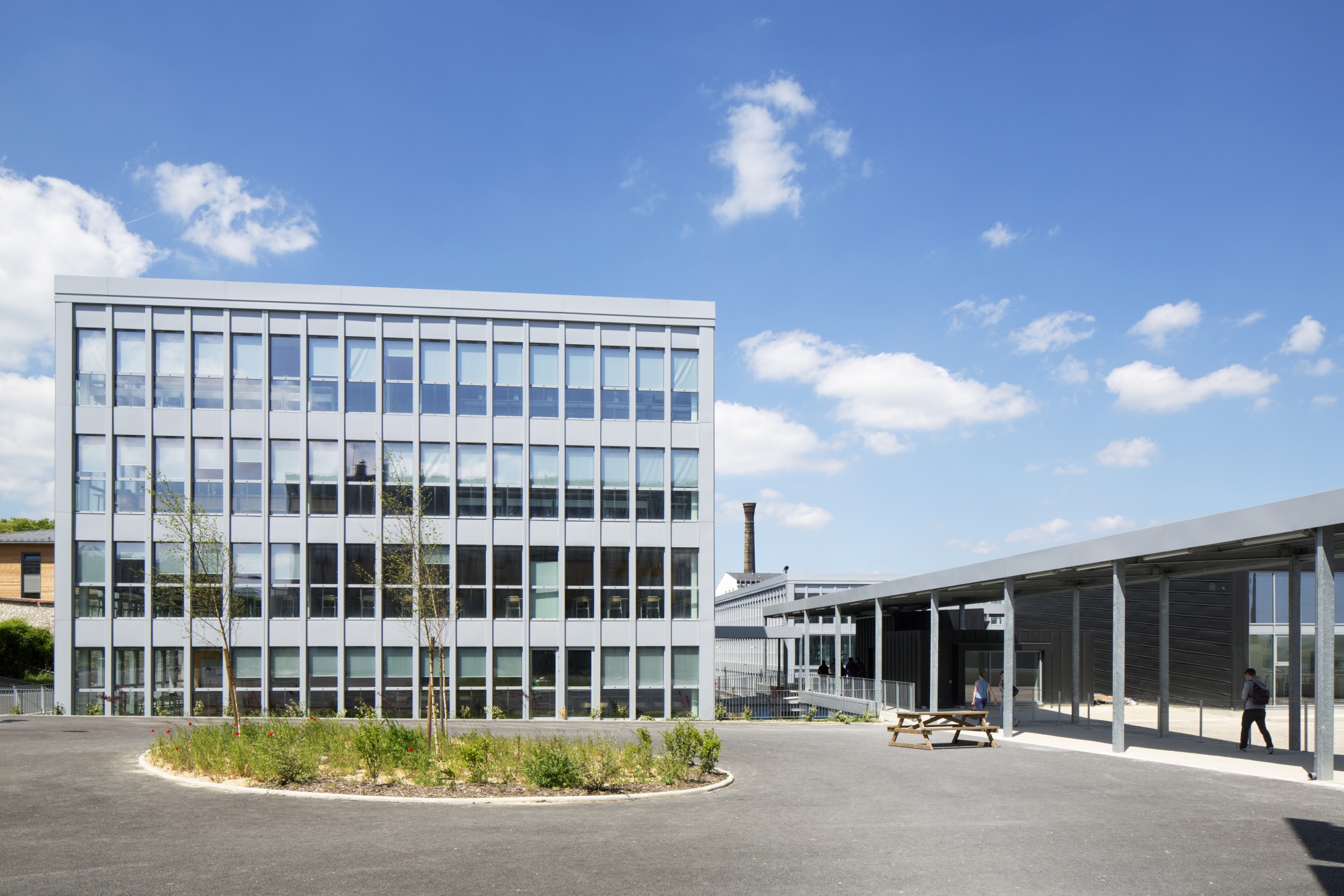 Retrouver une simplicité et une lisibilité fonctionnelle : Conformément aux objectifs de la restructuration, notre travail a porté, dans un premier temps, sur la création d’un pôle à dominante tertiaire sur un site et d’un pôle à dominante industrielle sur l’autre. Ensuite, nous nous sommes efforcés d’identifier un bâtiment, une fonction afin d’assurer la plus grande lisibilité notamment depuis le cheminement de la rue intérieure (ex : un bâtiment pour les BTS, la vie scolaire, le CDI, les locaux des enseignants).