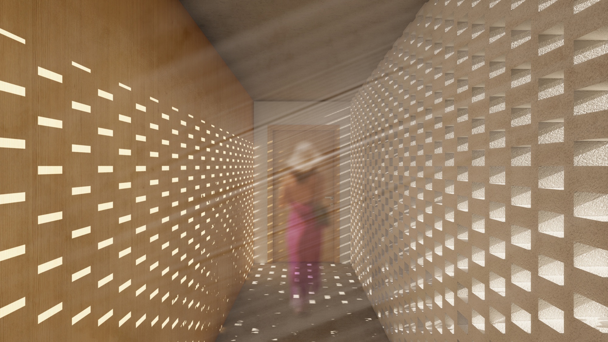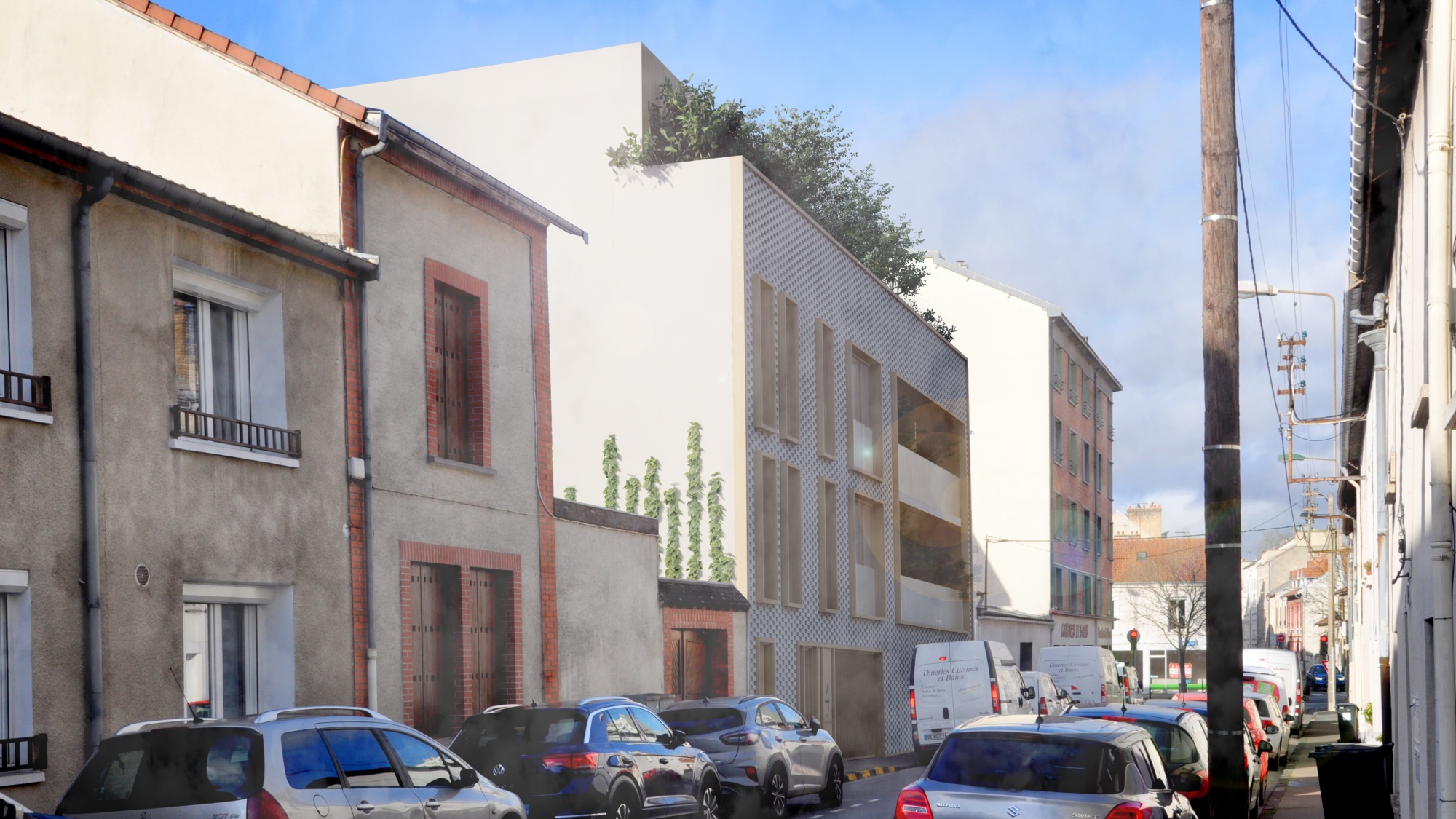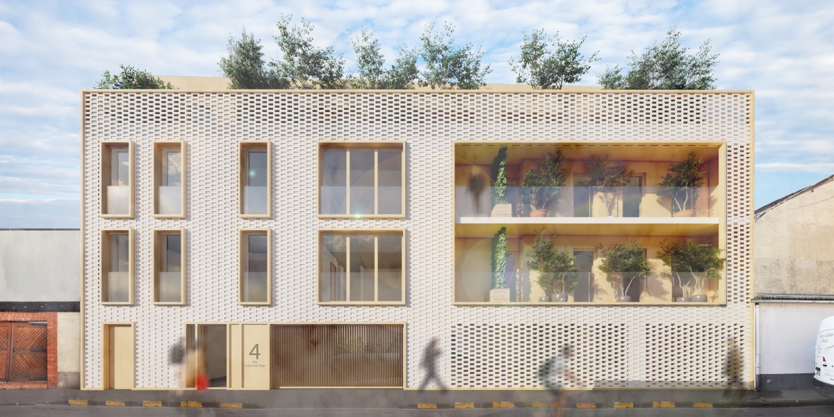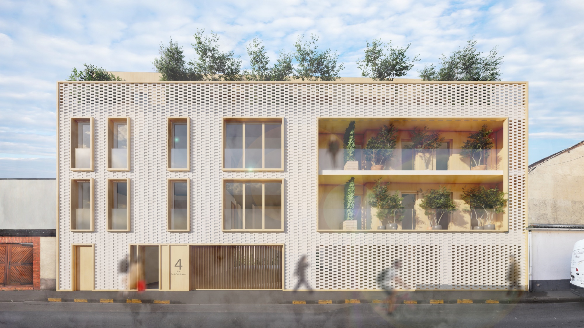 des approches à la fois novatrices et saines en termes de construction. De plus, et dans le cadre de la RE 2020, l’usage de matières biosourcées et naturelles est devenu une obligation. La façade principale sur la rue Croix-Saint-Marc figure comme la partie vue depuis l’espace public. Elle officie comme l’élément identitaire pour ce projet. Il s’agit ici de représenter la philosophie architecturale du projet. Une façade nappée d’un motif intégrant un moucharabieh pour la ventilation du parking, le garde-corps du 3ème étage et un motif en façade intégrant les ouvertures vitrées et les balcons des appartements.