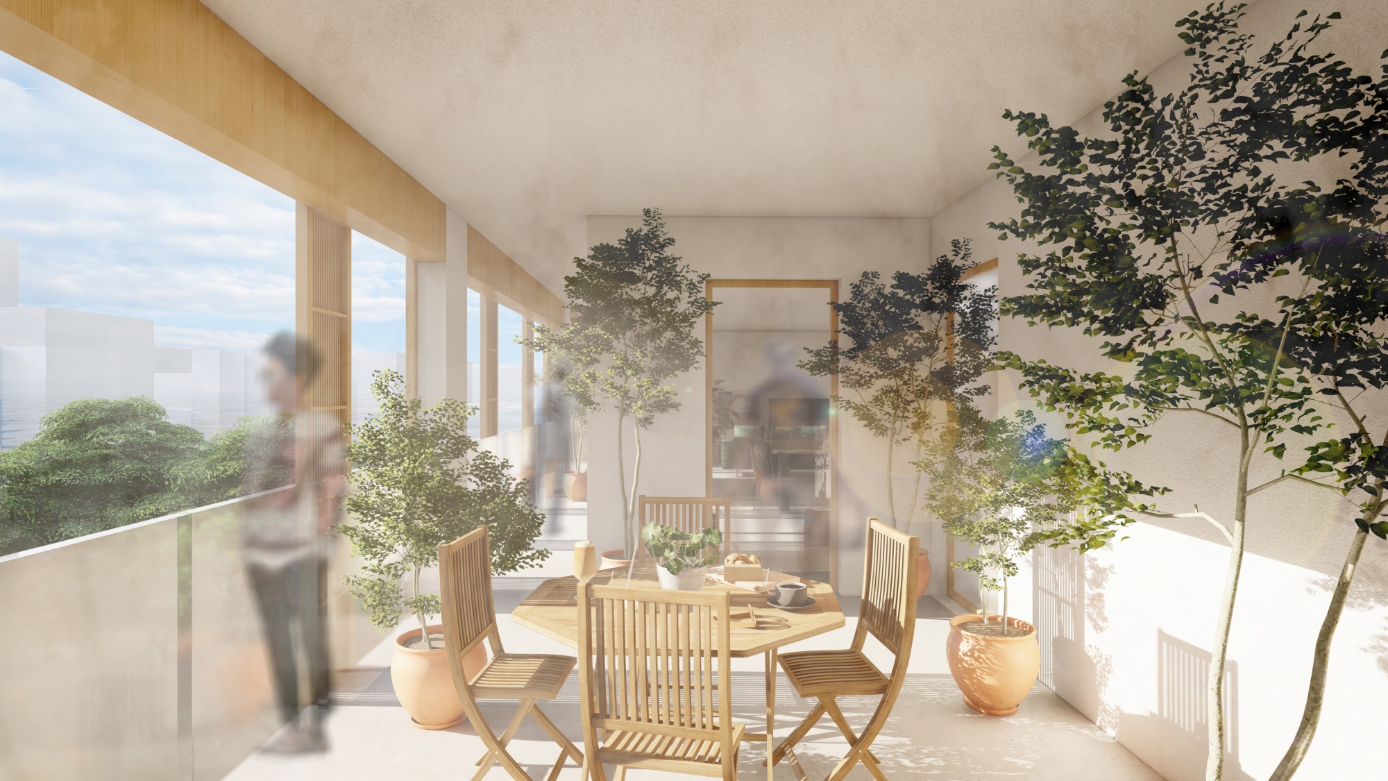 Ce projet accueille 1 T1Bis, 2 T2, 4 T3 et 3 T4. Chacun de ces appartements possède un accès à l’extérieur. L’orientation des façades nous a contraint à placer des balcons afin de se protéger du surensoleillement l’été. Des galeries ventilées viennent présenter une configuration spatiale capable de se protéger de la chaleur tout en préservant l’intimité des locataires.