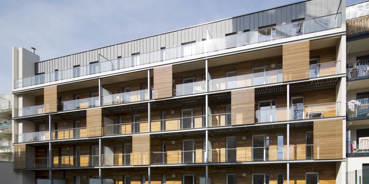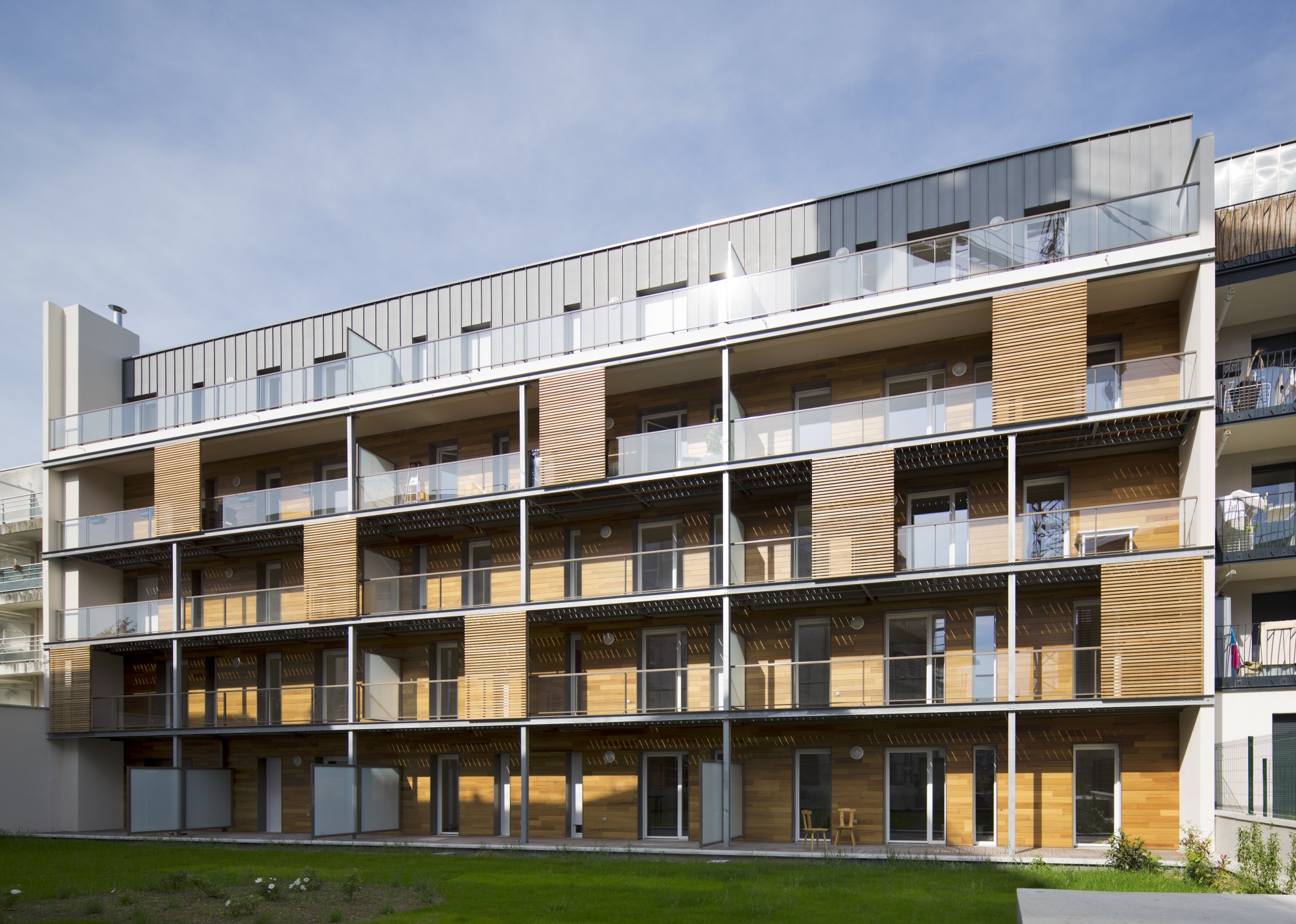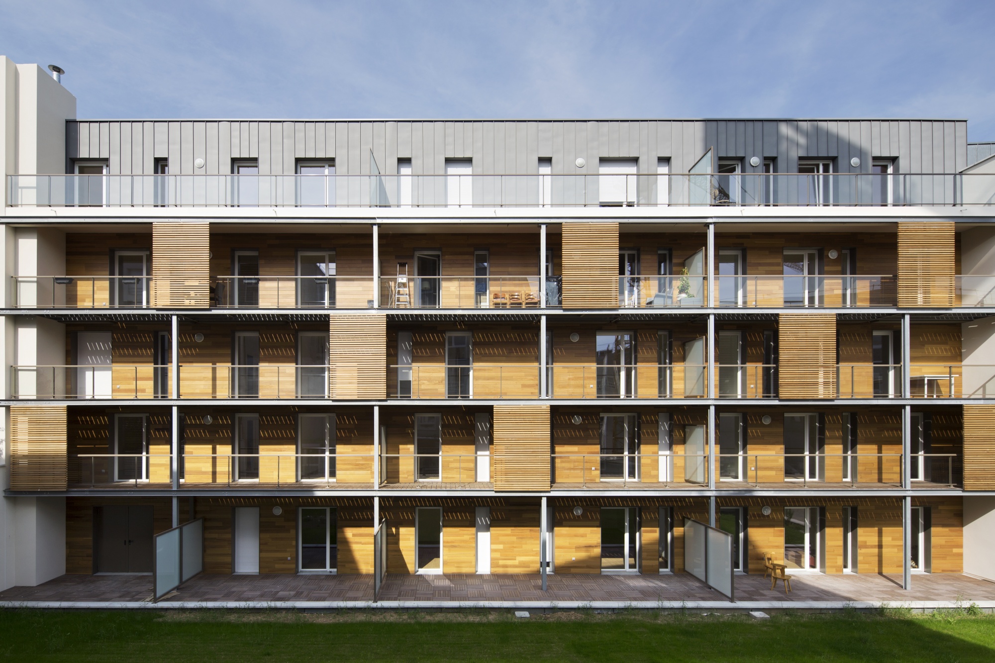 Sur la rue des Coutures est donc créée une façade urbaine, en alignement, au rez de chaussée avec traitement zinc naturel. Les étages supérieurs, en retrait de rue d’une distance d’un mètre cinquante, présentent un ensemble de panneaux mobiles à parement bois positionnés à l’alignement de rue permettant d’occulter les loggias privatives et les séquences vitrées à dominante verticale de la véritable façade, cette dernière de couleur vert pâle. Les bandeaux horizontaux en acier laqué gris, marquant les planchers des loggias assurent la liaison avec le bâtiment promotion privée voisin et recréent ainsi une continuité urbaine sur la rue des Coutures. Ces bandeaux acier permettent en outre d’intégrer les rails des panneaux mobiles. Ces panneaux bois permettent une occultation partielle ou totale des loggias, apportant ainsi un confort thermique par une protection au froid et aux vents ou un apport solaire suivant leur positionnement et les moments de la journée ou les conditions climatiques.