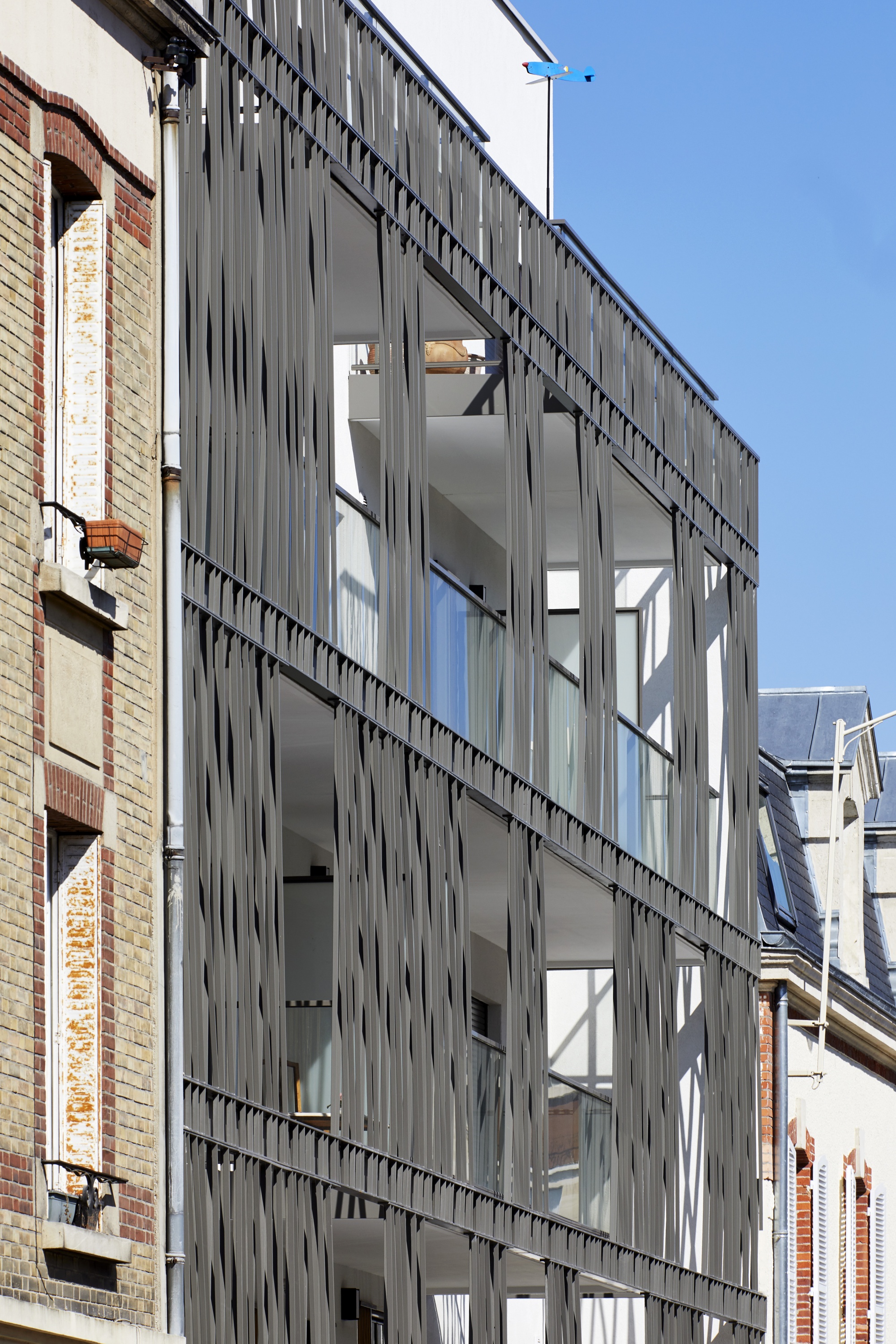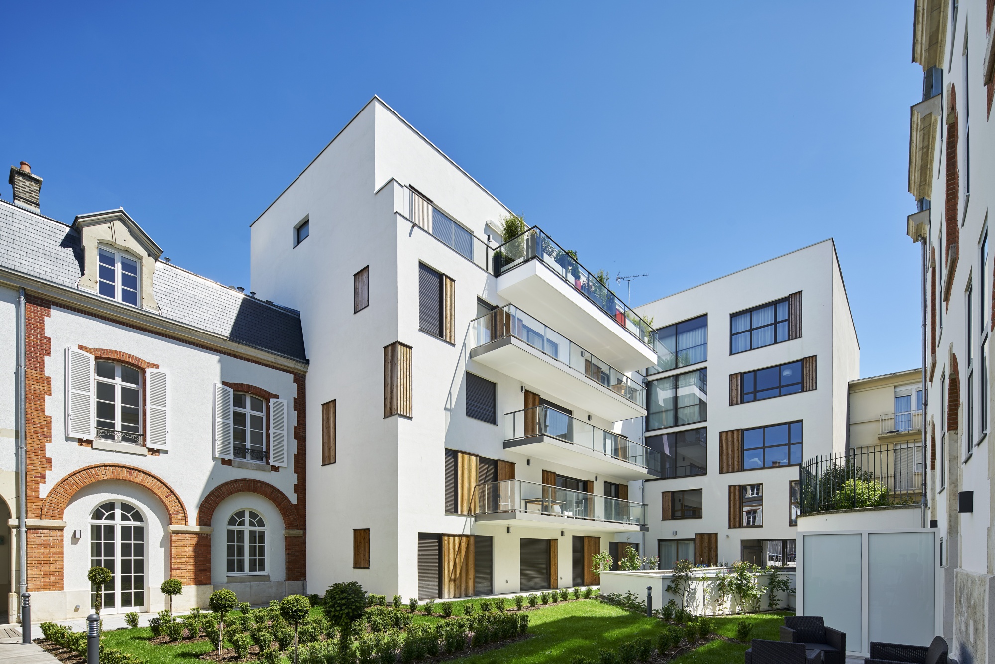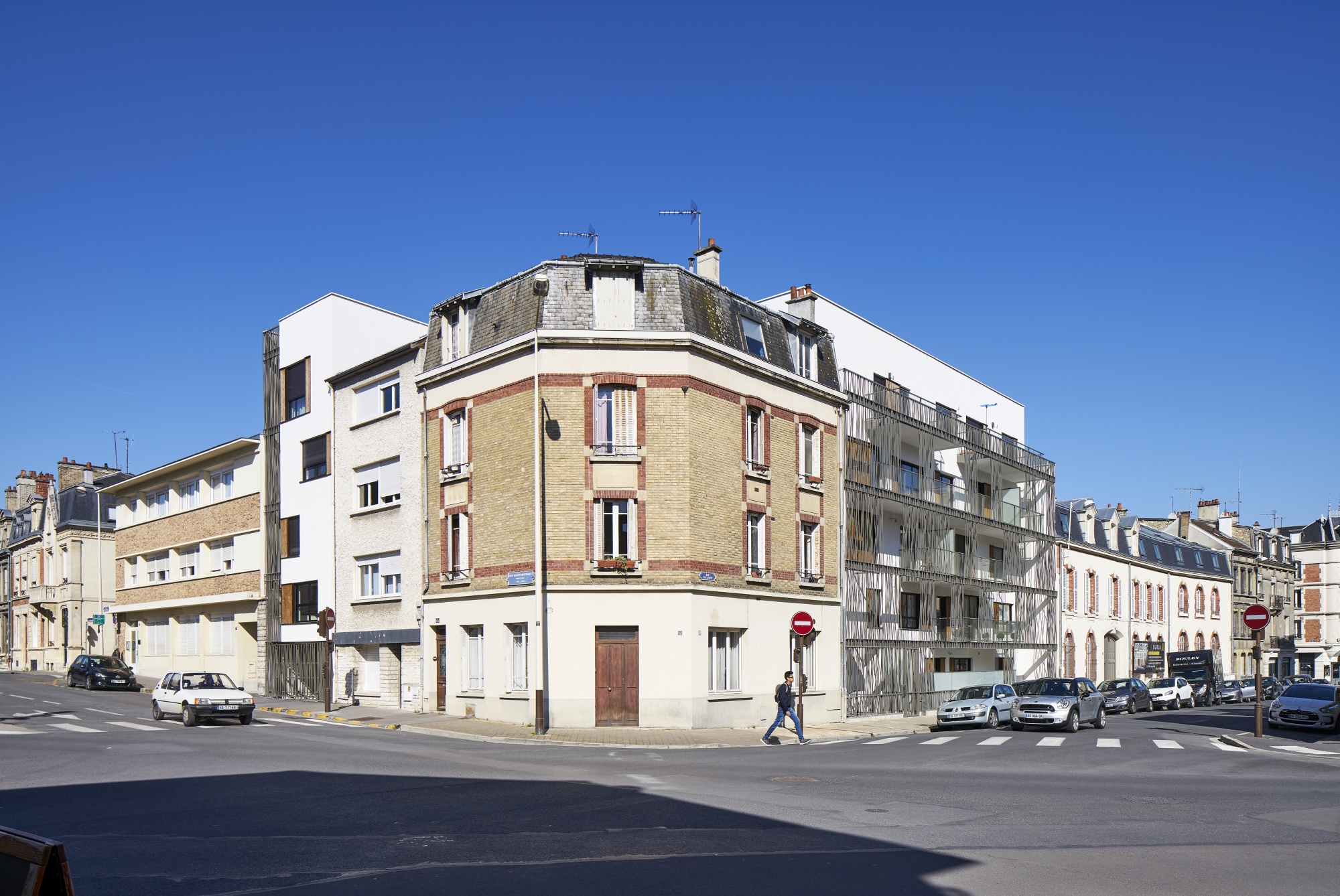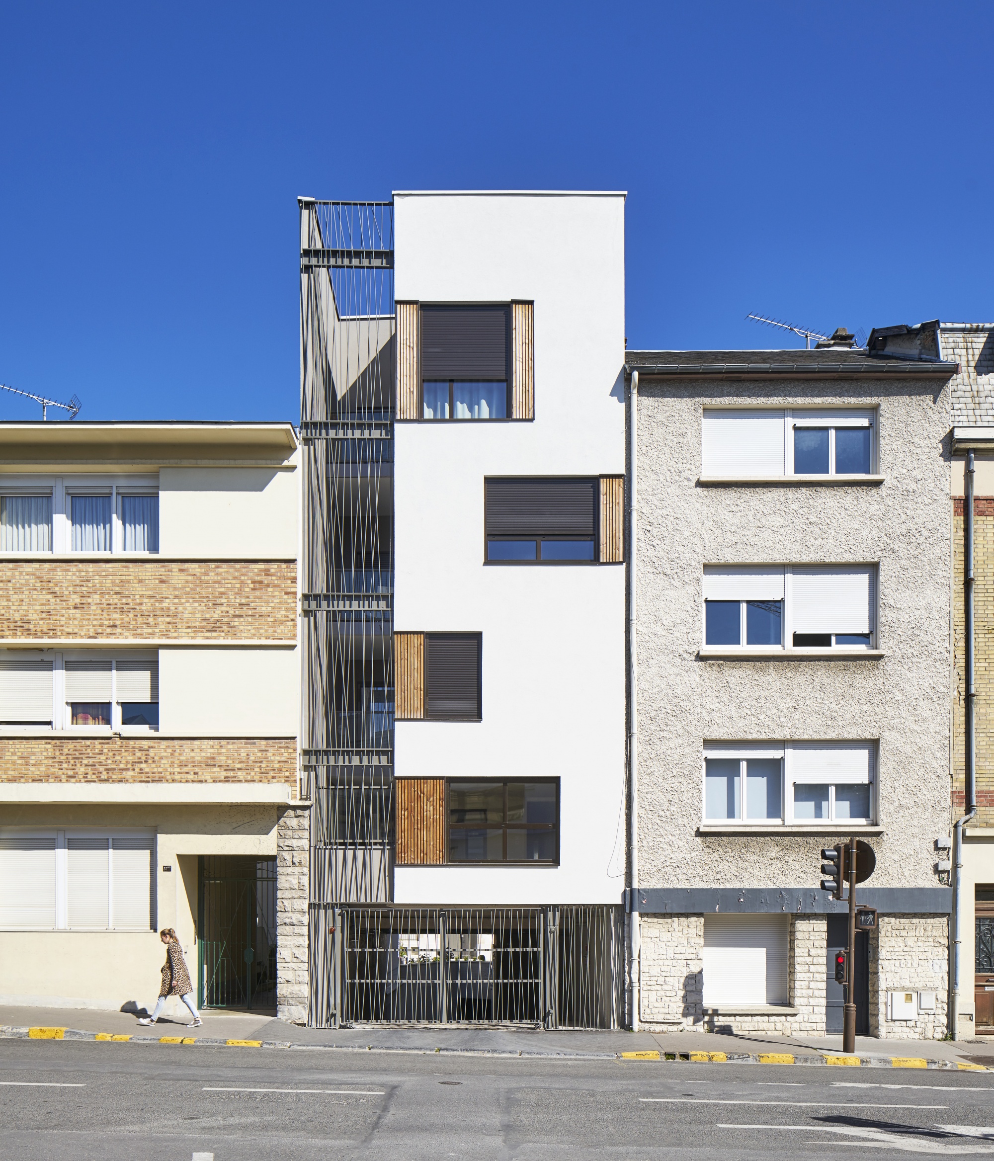 La maison de maître établie sur la rue Ponsardin est conservée et simplement réaménagée avec des bureaux au rez-de-chaussée et des logements aux étages, dans le respect de son aspect d’origine. Le bâtiment contigu qui servait hier d’hébergement aux vendangeurs est en revanche rasé et remplacé par un immeuble neuf d’habitation construit entre mitoyens. L’alignement de la rue est repris sur les quatre premiers niveaux par une façade ajourée, rapportée en premier plan devant les balcons pour protéger des nuisances (rue très passante), préserver l’intimité et insérer une modénature contemporaine à l’instar des nombreuses architectures Art Déco ou éclectiques qui caractérisent La ville.