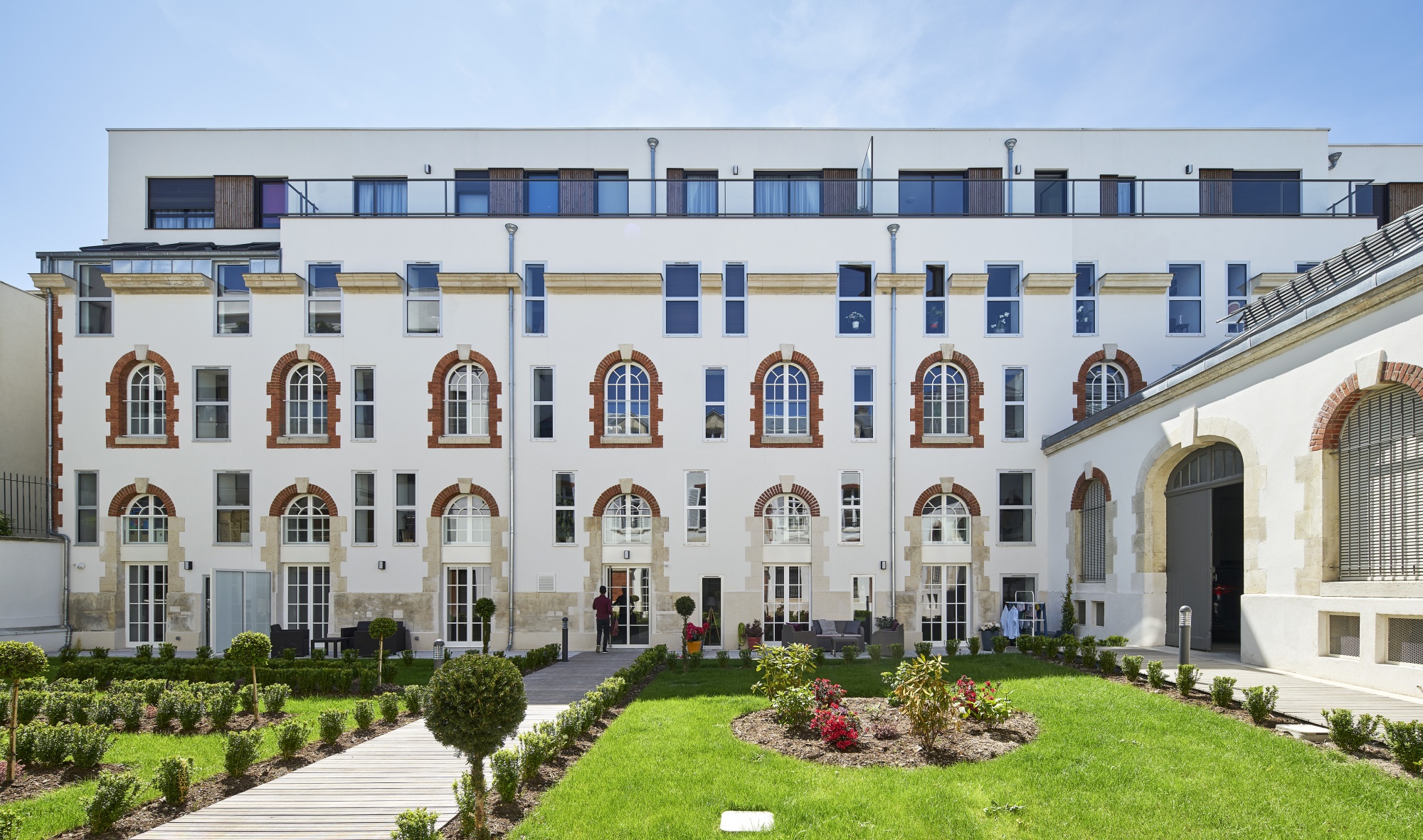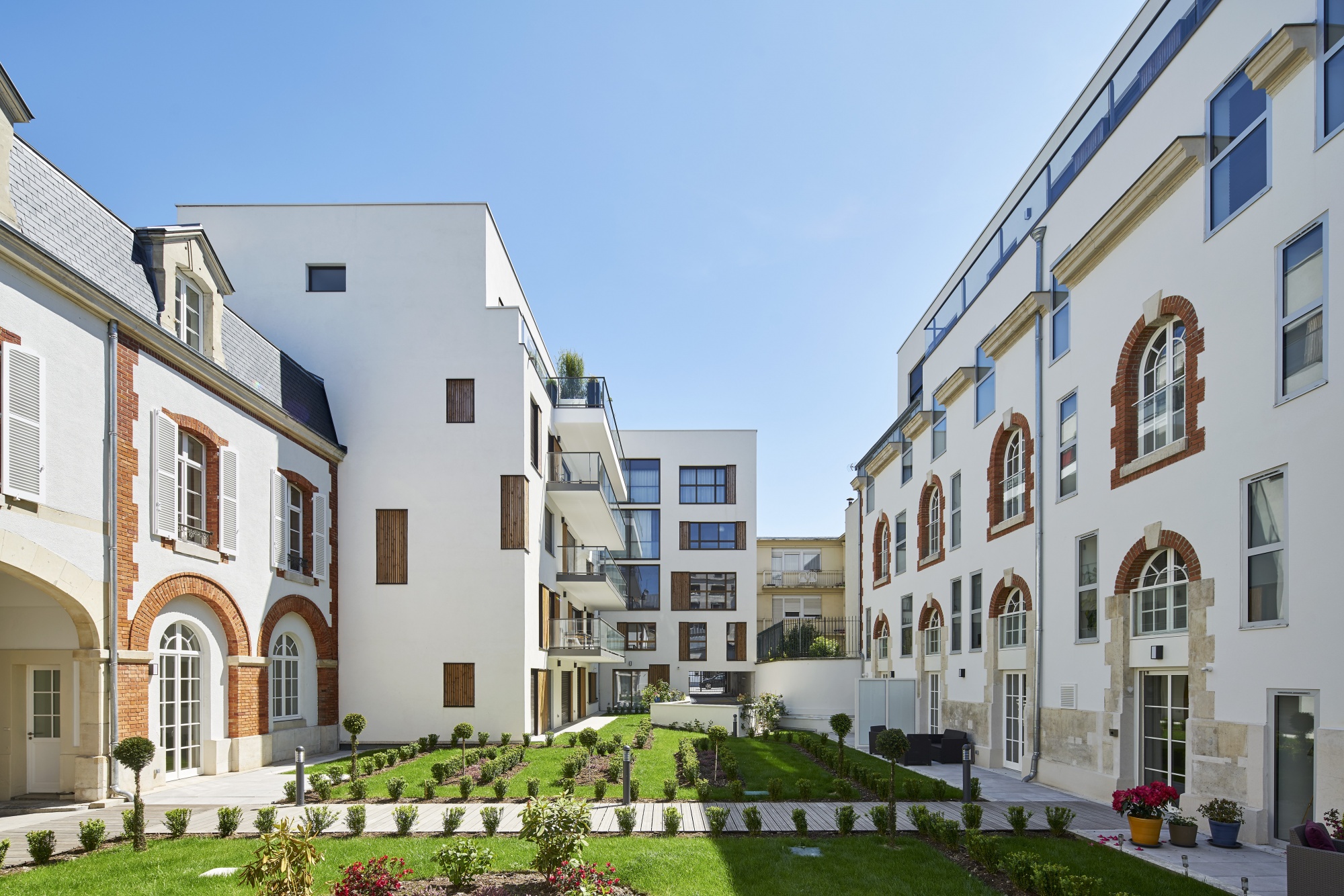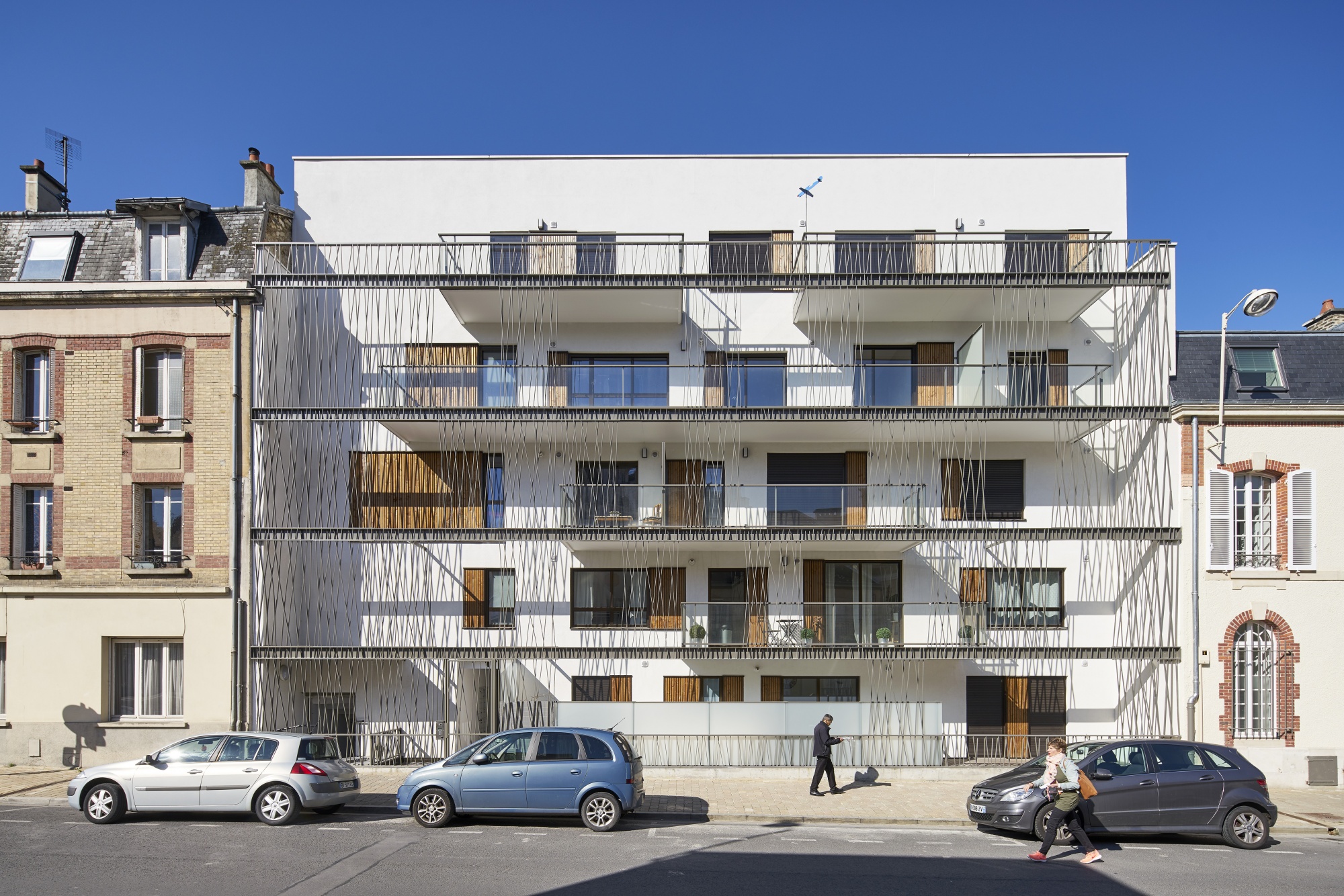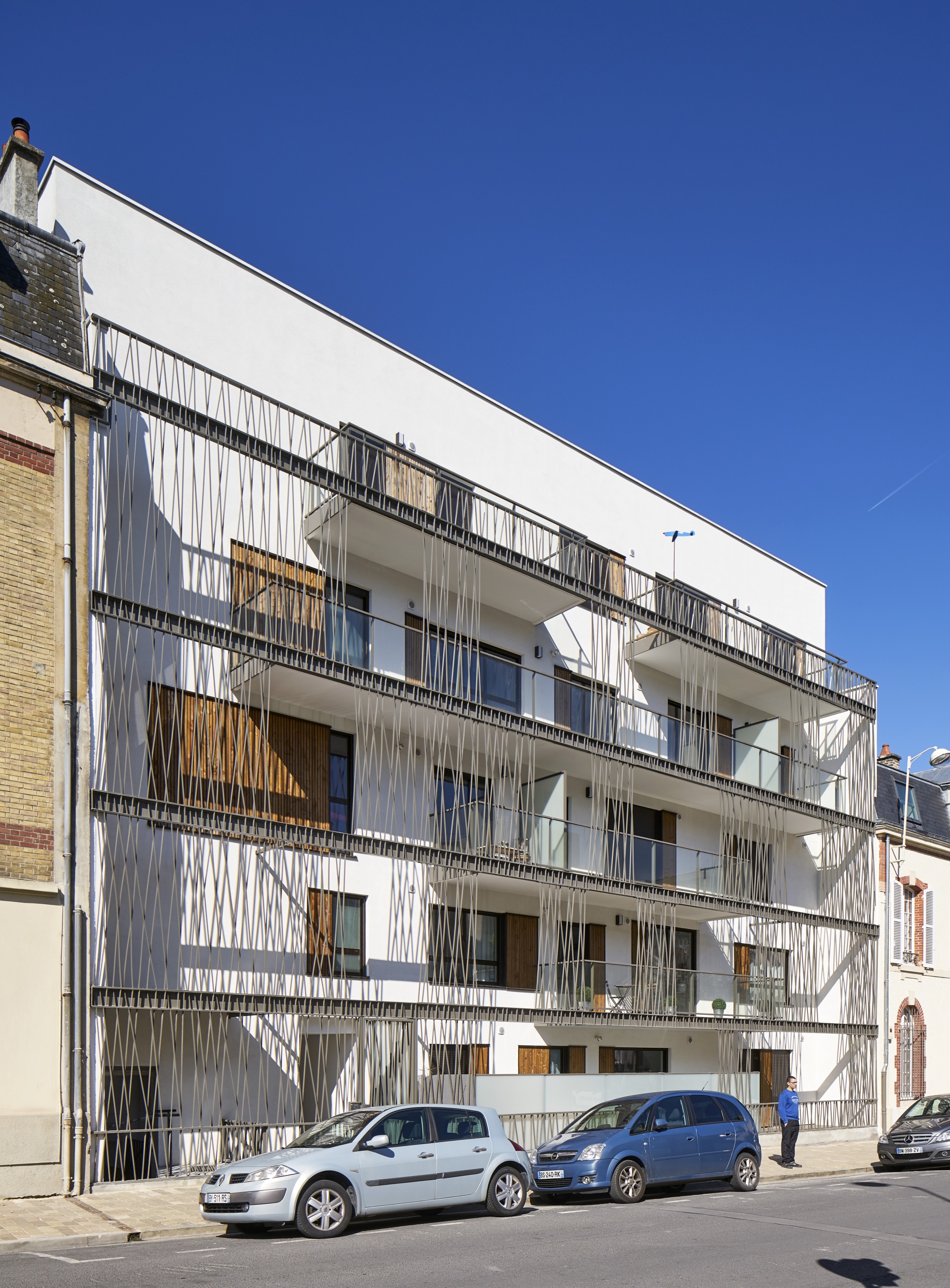 La maison de maître établie sur la rue Ponsardin est conservée et simplement réaménagée avec des bureaux au rez-de-chaussée et des logements aux étages, dans le respect de son aspect d’origine. Le bâtiment contigu qui servait hier d’hébergement aux vendangeurs est en revanche rasé et remplacé par un immeuble neuf d’habitation construit entre mitoyens. L’alignement de la rue est repris sur les quatre premiers niveaux par une façade ajourée, rapportée en premier plan devant les balcons pour protéger des nuisances (rue très passante), préserver l’intimité et insérer une modénature contemporaine à l’instar des nombreuses architectures Art Déco ou éclectiques qui caractérisent La ville.