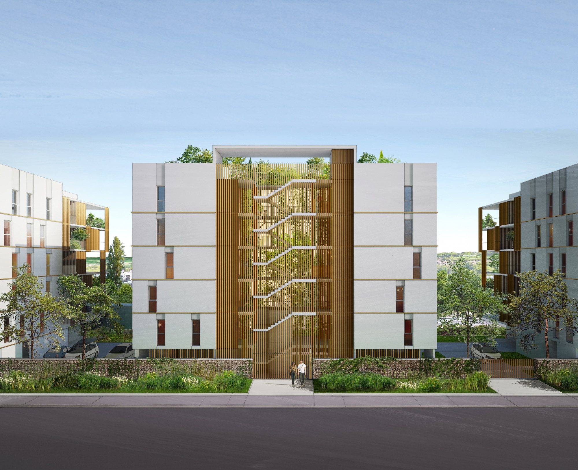 Le projet s’appuie sur le vocabulaire urbain décliné dans le quartier, notamment : végétation abondante représentée sous plusieurs formes en fonction des espaces et des usages, gestion des eaux pluviales utilisée comme structure spatiale et écologique, simplicité, sobriété et fonctionnalité des matériaux. La volonté du mieux vivre avec son environnement se traduit notamment dans la générosité des jardins composés avec l’architecture, donnant lieux à une diversité d’espaces à disposition des usagers comme les patios, les cours-jardinées, le jardin-clos, les terrasses-jardins et les bandes champêtres, vecteurs de bien-être et de sociabilité.