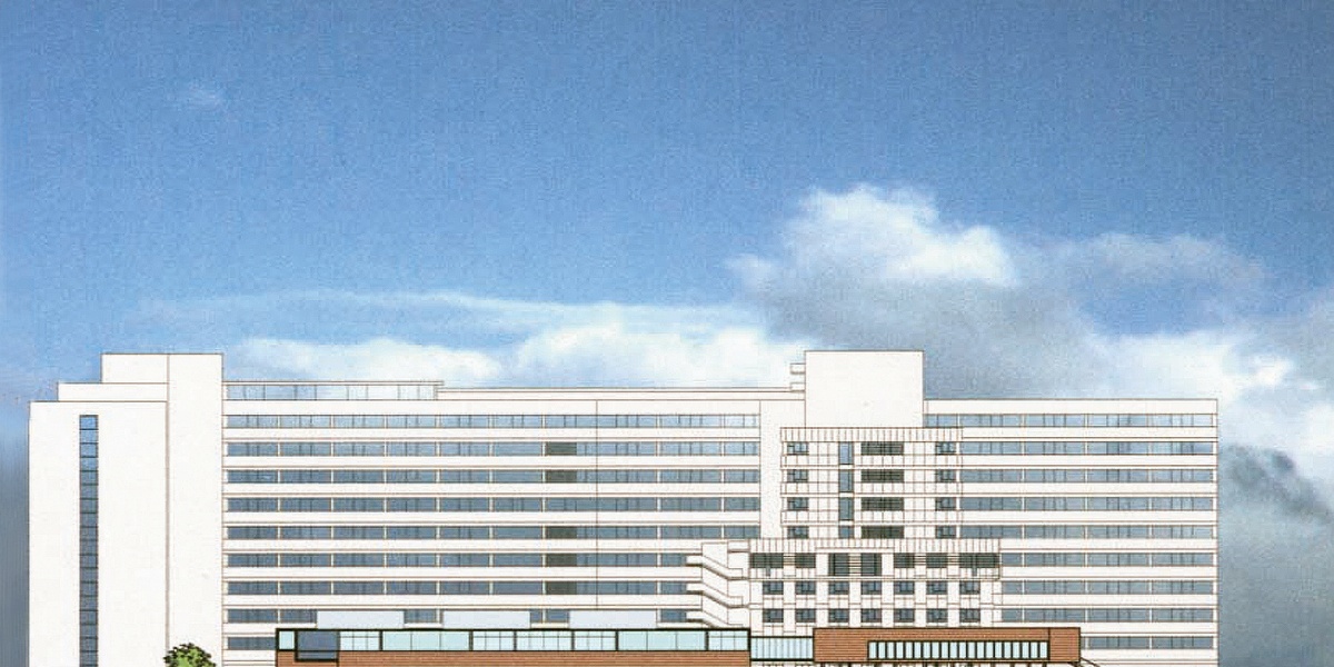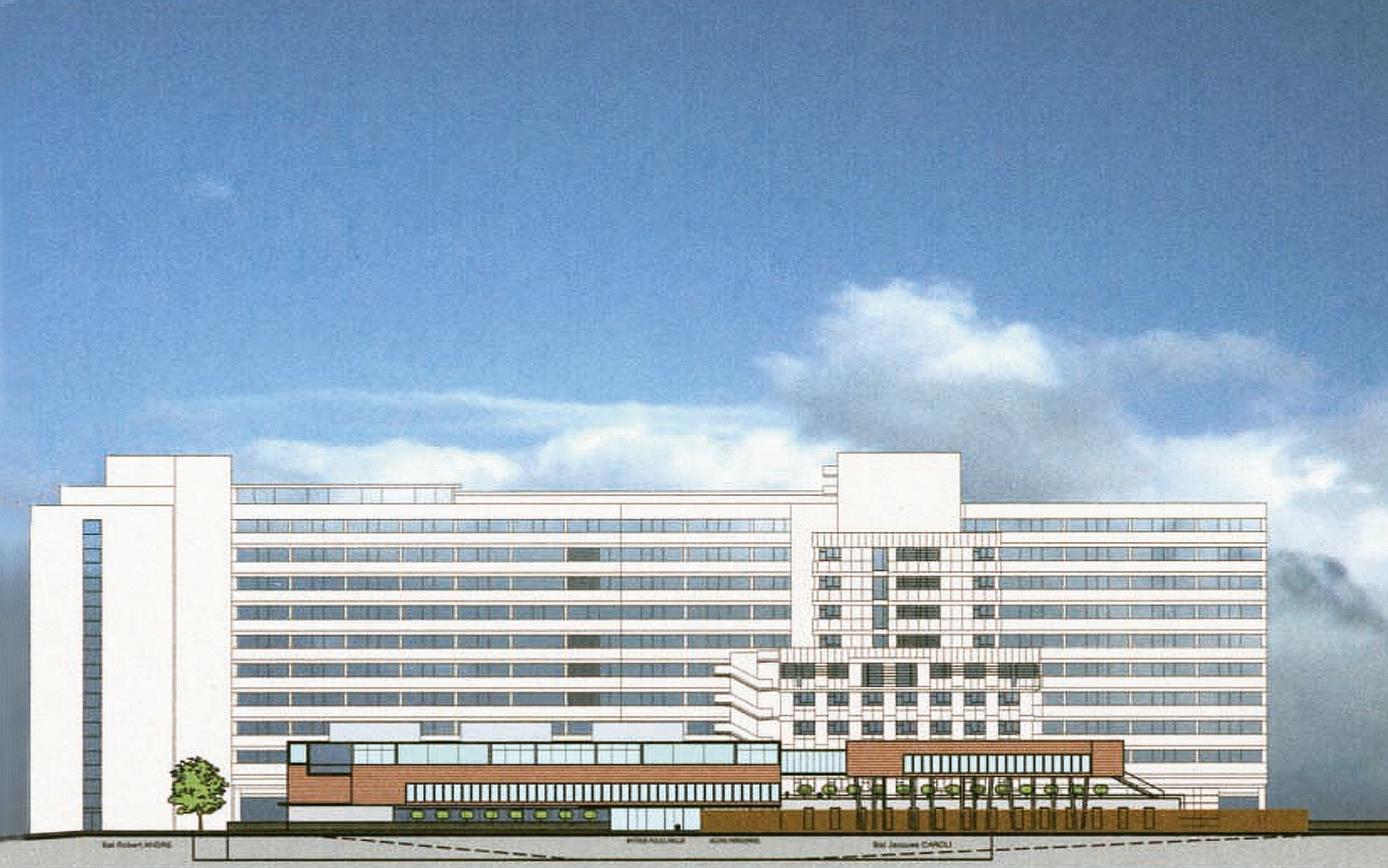 Le site et le programme de la future construction induisent un volume bas (R + 2) se développant peu ou prou à l’alignement de la voirie intérieure à l’hôpital. L’extrême densité du site, l’altitude des bâtiments André et Caroli (R + 10) l’encadrant vont générer un ensemble de vues sur ce bâtiment et notamment de vues hautes depuis ces derniers. Il va donc devenir le point de référence, l’accroche visuelle au sol pour les 400 fenêtres le surplombant, c’est pourquoi, nous pensons qu’il est souhaitable d’apporter à la composition un sentiment de sérénité, basé sur un ensemble de terrasses végétalisées ou bien traitées dans cet esprit. L’absence d’infrastructure technique en toiture, l’organisation et la composition de ces terrasses devraient éviter toute dramatisation technologique de cet espace.