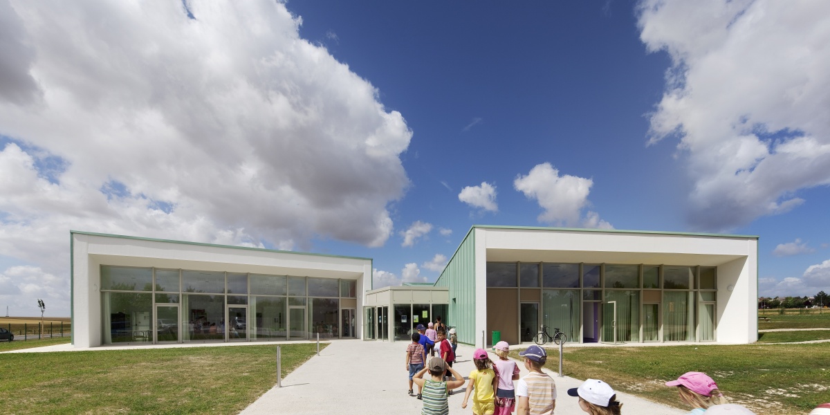 Le cabinet d'architectes Fouqueray-Jacquet a imaginé un ensemble composé de deux grands bâtiments quasi identiques, accueillant l'un la salle de restaurant, l'autre l'espace commun d'activités, le tout relié par un hall d'accueil.