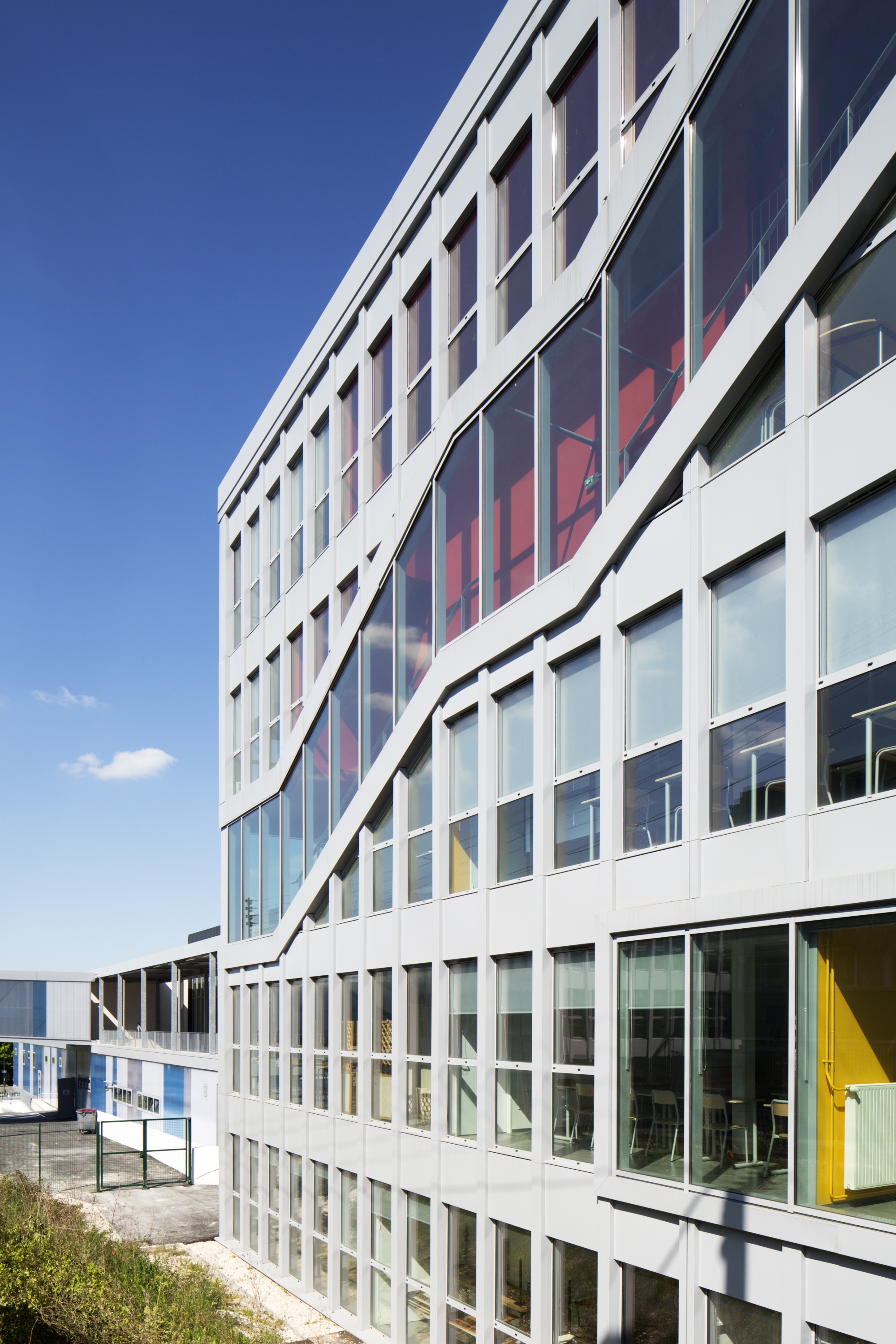 Retrouver une simplicité et une lisibilité fonctionnelle : Conformément aux objectifs de la restructuration, notre travail a porté, dans un premier temps, sur la création d’un pôle à dominante tertiaire sur un site et d’un pôle à dominante industrielle sur l’autre. Ensuite, nous nous sommes efforcés d’identifier un bâtiment, une fonction afin d’assurer la plus grande lisibilité notamment depuis le cheminement de la rue intérieure (ex : un bâtiment pour les BTS, la vie scolaire, le CDI, les locaux des enseignants).