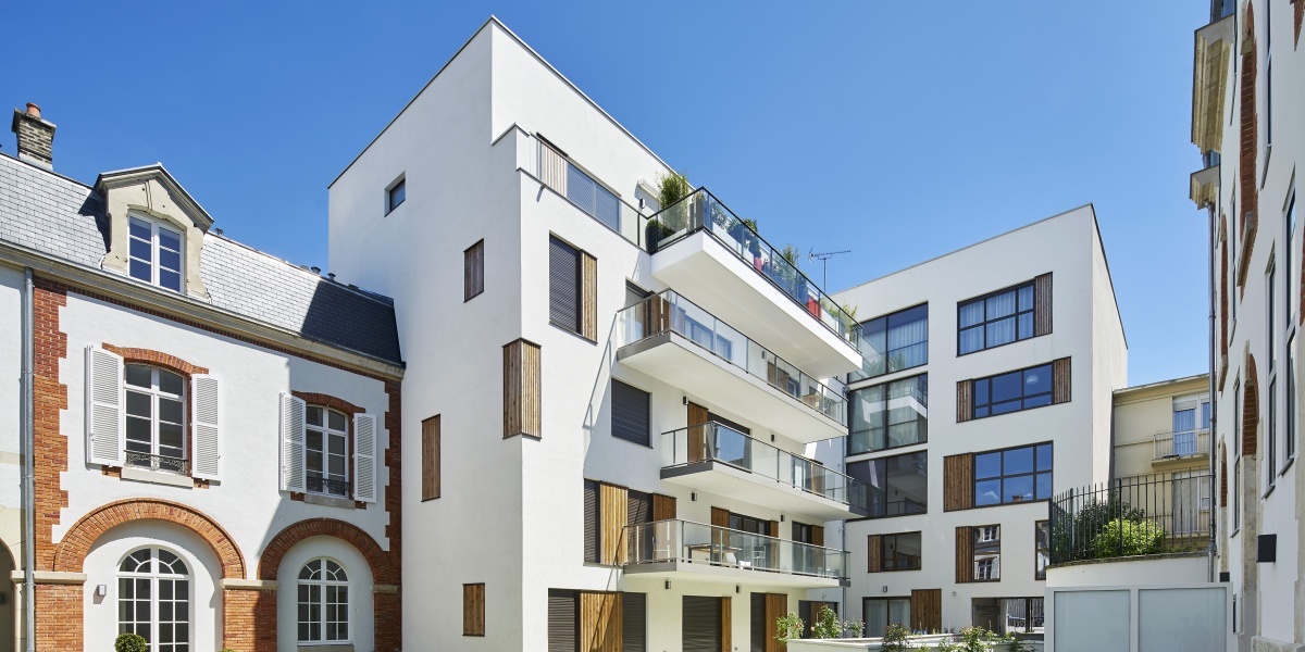 La maison de maître établie sur la rue Ponsardin est conservée et simplement réaménagée avec des bureaux au rez-de-chaussée et des logements aux étages, dans le respect de son aspect d’origine. Le bâtiment contigu qui servait hier d’hébergement aux vendangeurs est en revanche rasé et remplacé par un immeuble neuf d’habitation construit entre mitoyens. L’alignement de la rue est repris sur les quatre premiers niveaux par une façade ajourée, rapportée en premier plan devant les balcons pour protéger des nuisances (rue très passante), préserver l’intimité et insérer une modénature contemporaine à l’instar des nombreuses architectures Art Déco ou éclectiques qui caractérisent La ville.